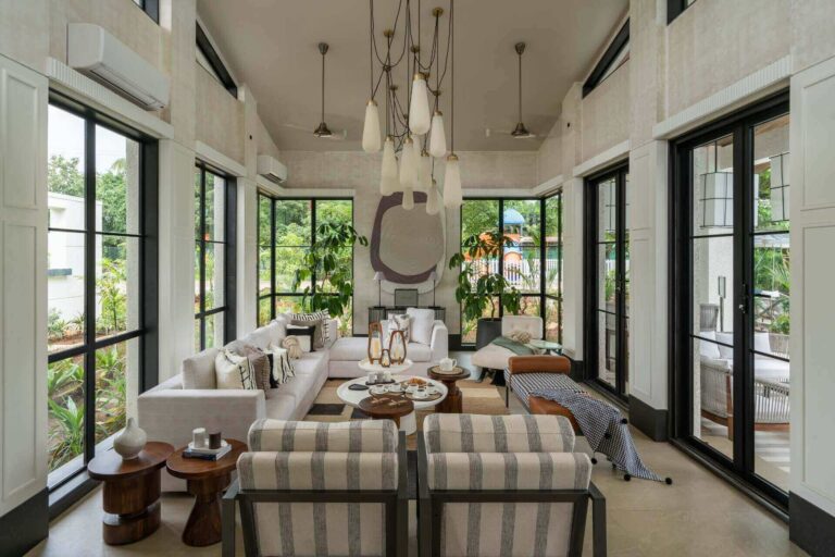 Estate de Sereno welcomes you with lofty ceilings, expansive terraces, and panoramic views of Alibaug’s lush landscape, creating a setting that’s both serene and striking.