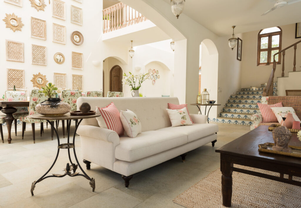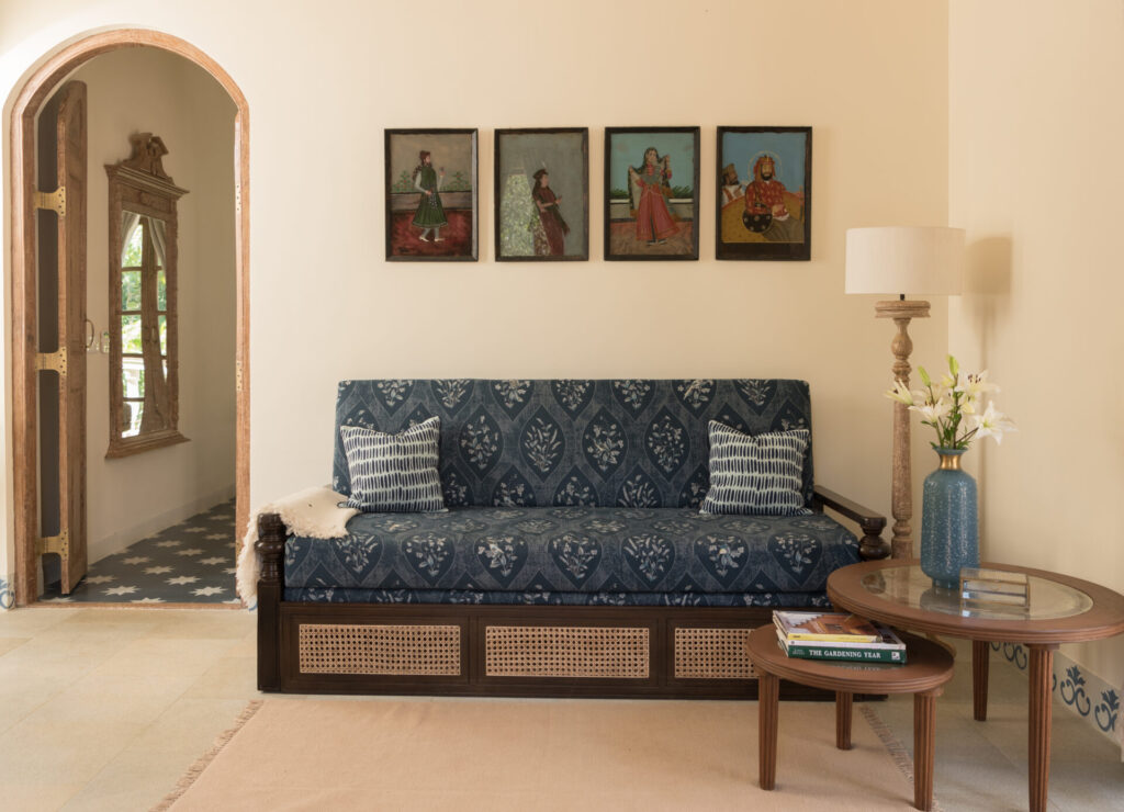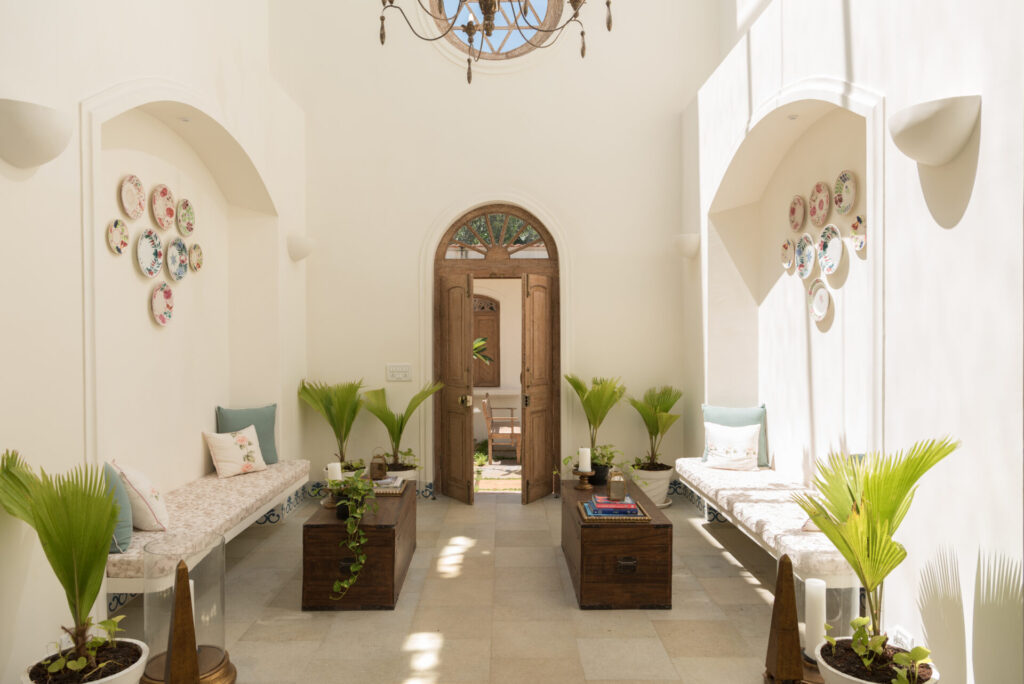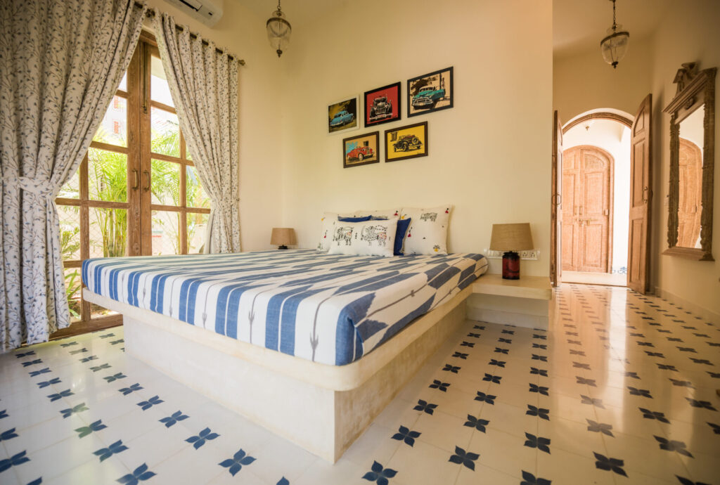 Inside, Igreha Vaddo, Villa C offers a luxurious yet comfortable ambiance. The interiors combine antique décor with modern furniture, creating a timeless feel. Handcrafted tiles and stones from Rajasthan and Karnataka adorn the floors, adding warmth and character. Unique features like cobalt blue tiles on the staircase and reclaimed wooden doors enhance the villa’s charm.