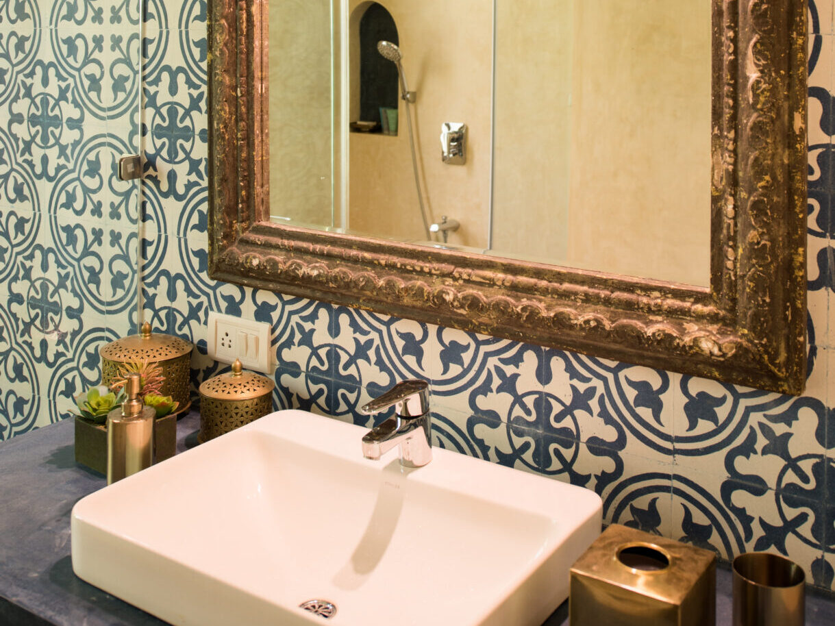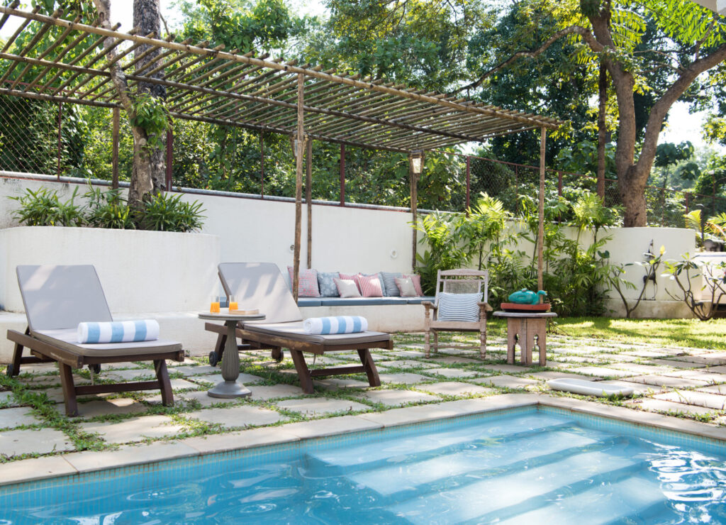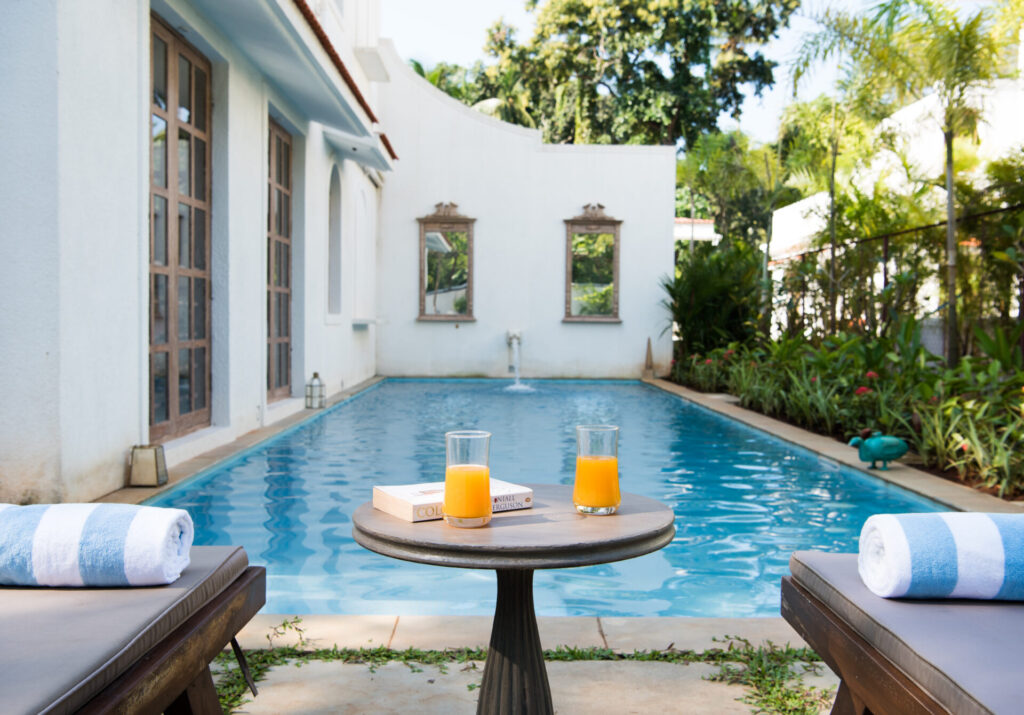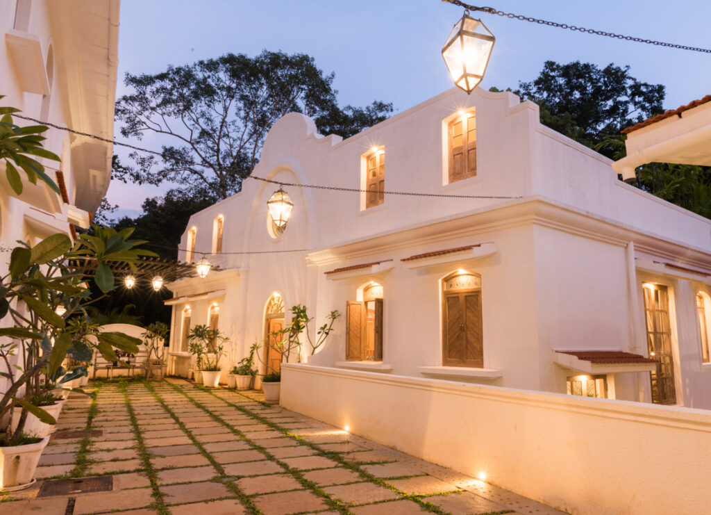 Inside, Igreha Vaddo, Villa C offers a luxurious yet comfortable ambiance. The interiors combine antique décor with modern furniture, creating a timeless feel. Handcrafted tiles and stones from Rajasthan and Karnataka adorn the floors, adding warmth and character. Unique features like cobalt blue tiles on the staircase and reclaimed wooden doors enhance the villa’s charm.