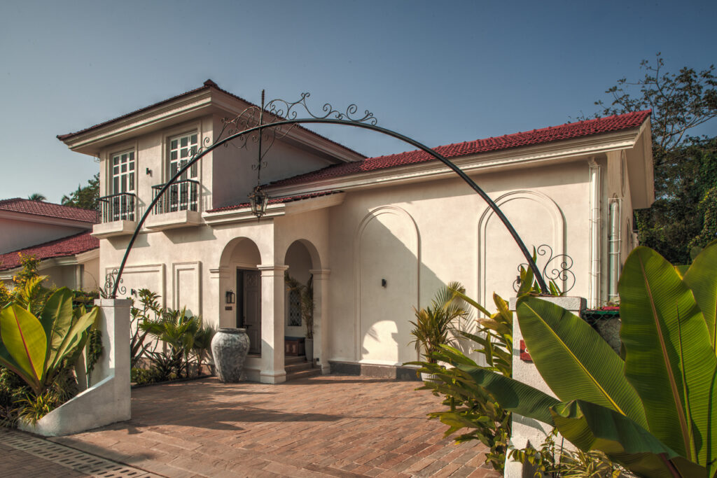 The villa’s architecture is a contemporary take on Goa’s Portuguese heritage. Grand entrance foyers with tall columns, intricately carved wooden doors, and large ornamental windows bring sunlight and air into every corner. The dynamic layout flows naturally from room to room, offering a sense of openness and light, with the double-height glass roof adding a striking architectural focal point.