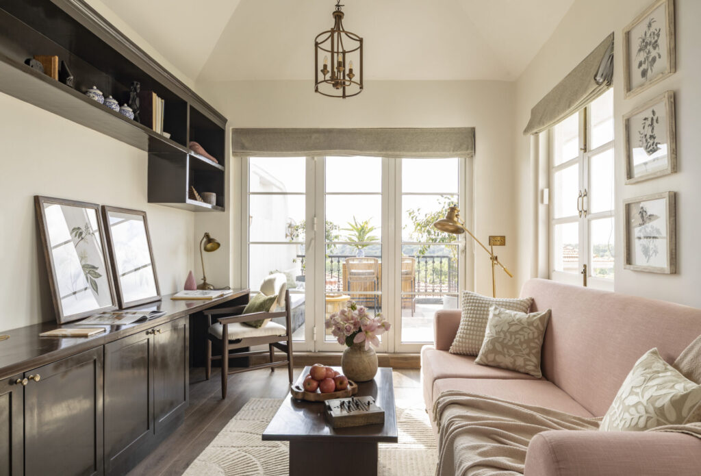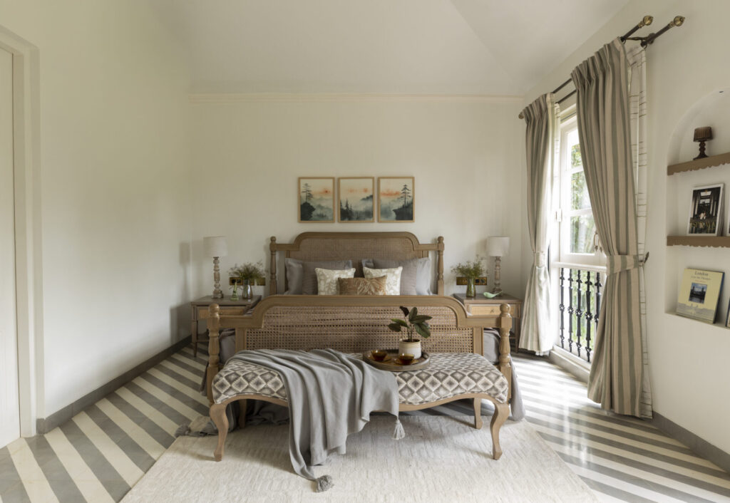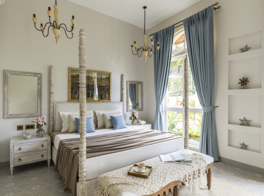 Inside, the villa is a celebration of heritage and refinement. The interiors feature a soft palette of off-whites, beiges, and coastal hues like indigo and teal, complemented by natural wood and handcrafted details. The use of Portuguese-inspired motifs on flooring, wall panels, and décor adds an element of continuity throughout the home, while furniture such as cane-backed dining chairs and four-poster beds creates a sense of warmth and comfort.