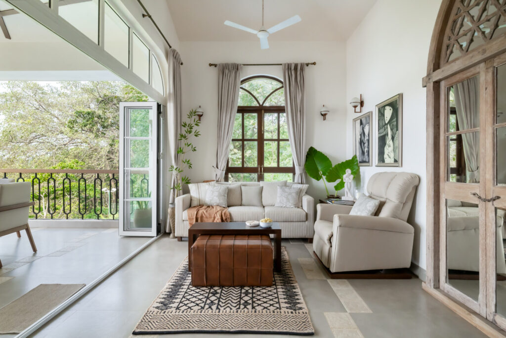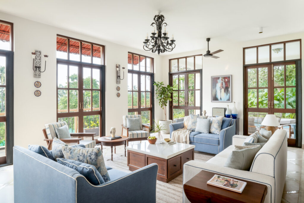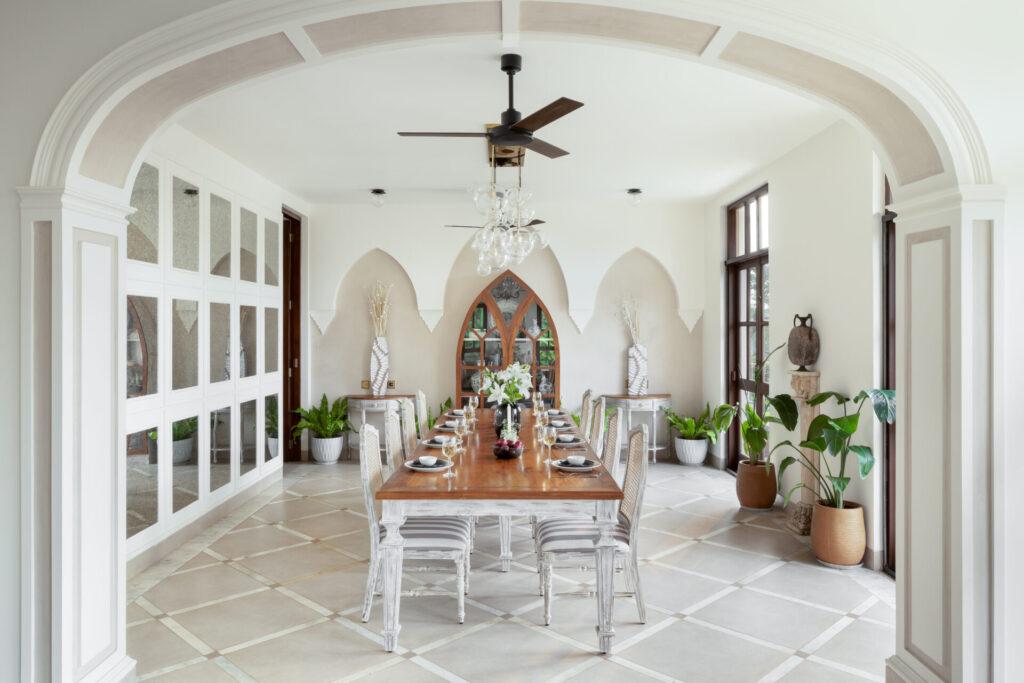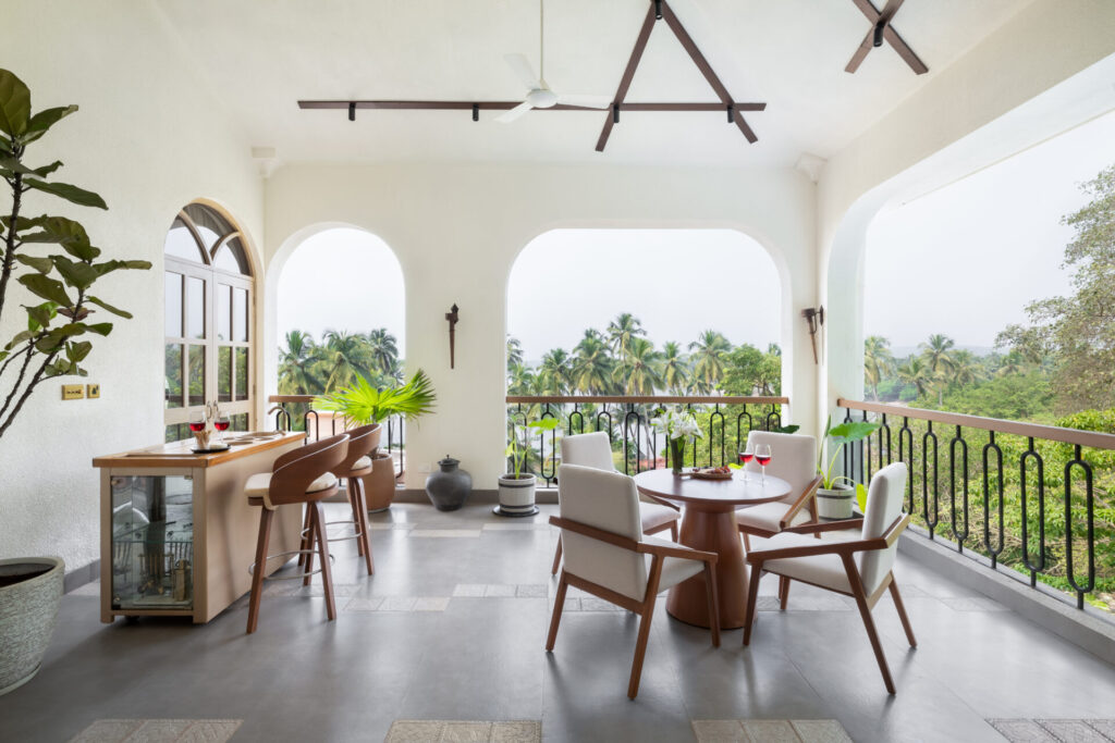 The home draws from traditional Goan-Portuguese architecture, reflected in its sloping rooflines, arched openings, and a columned entrance that feels both welcoming and assured. Nothing here is ornamental for its own sake. Every detail serves a purpose—creating flow, framing views, and allowing light to move naturally through the home.
