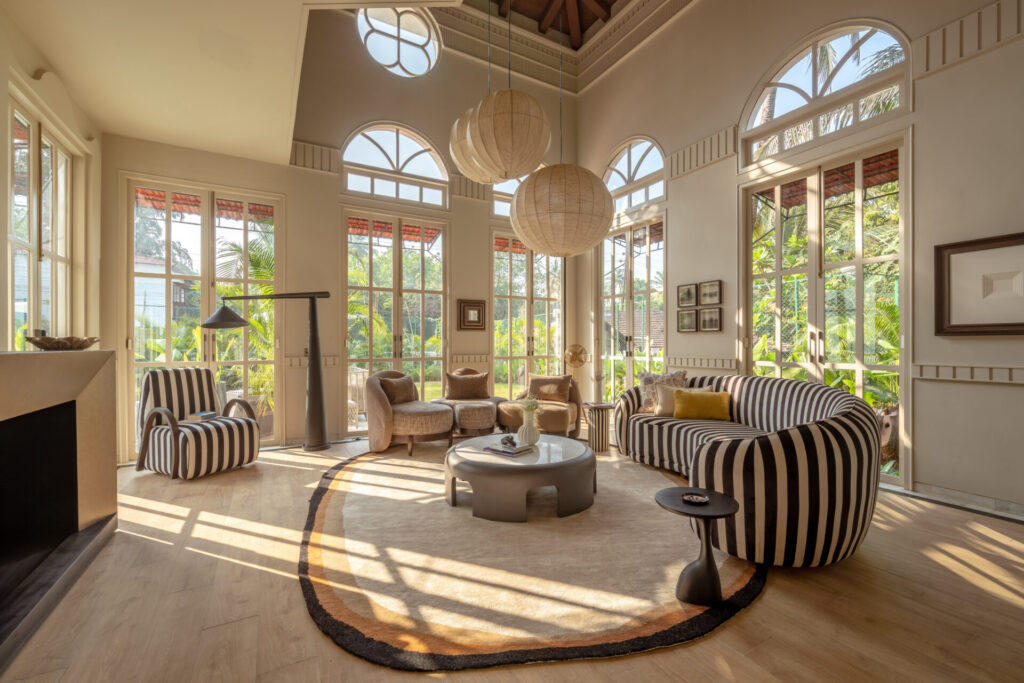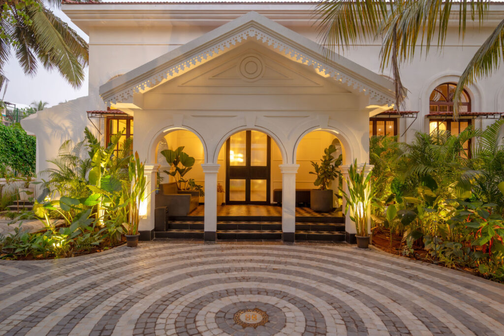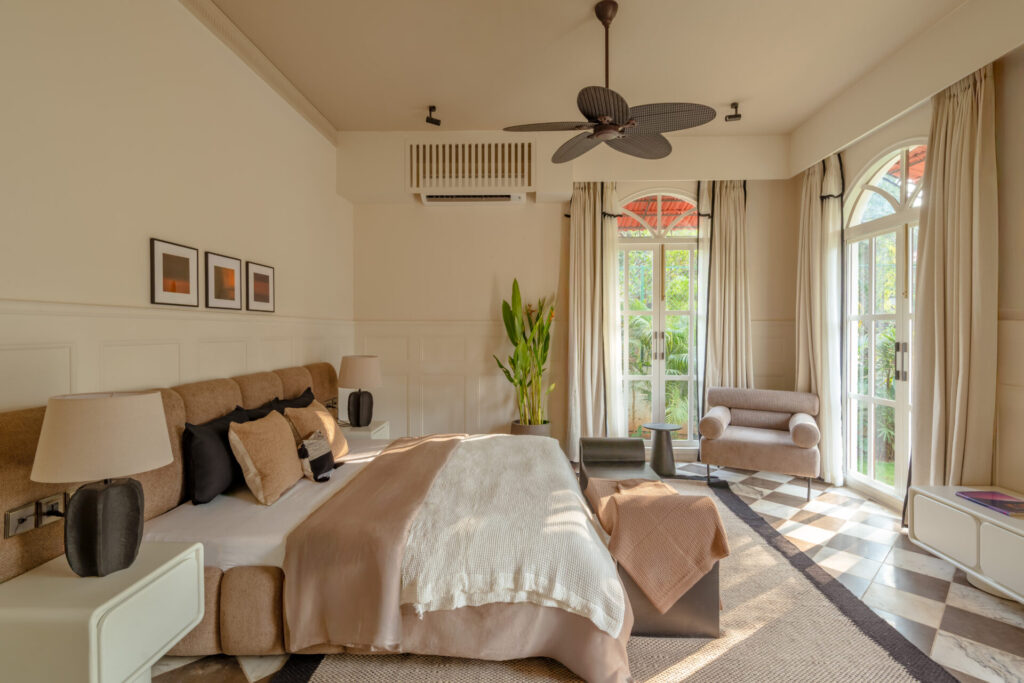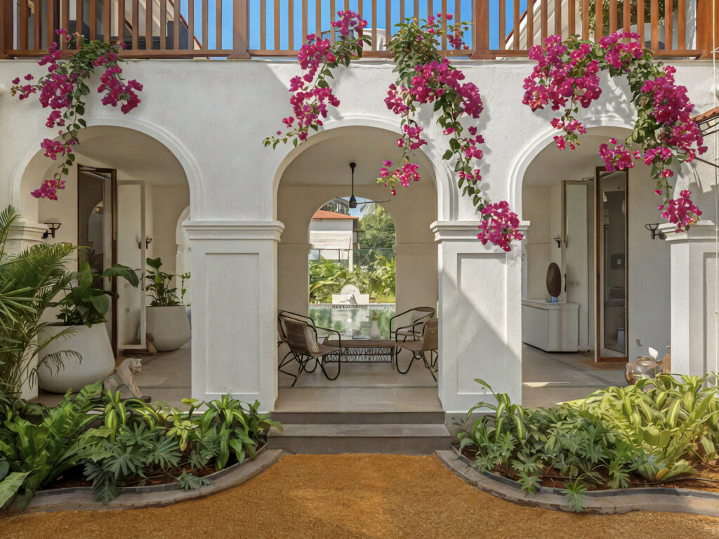 The architecture draws from Goan-Portuguese influences — sloping roofs, a warm colour palette, details that feel at home in Parra without explaining why. The home makes the most of what the village offers naturally: good sunlight, a steady breeze and room to settle in. The gardens are tended, the layout considered, and the interiors carry the same care — old-world in feeling, comfortable in practice.