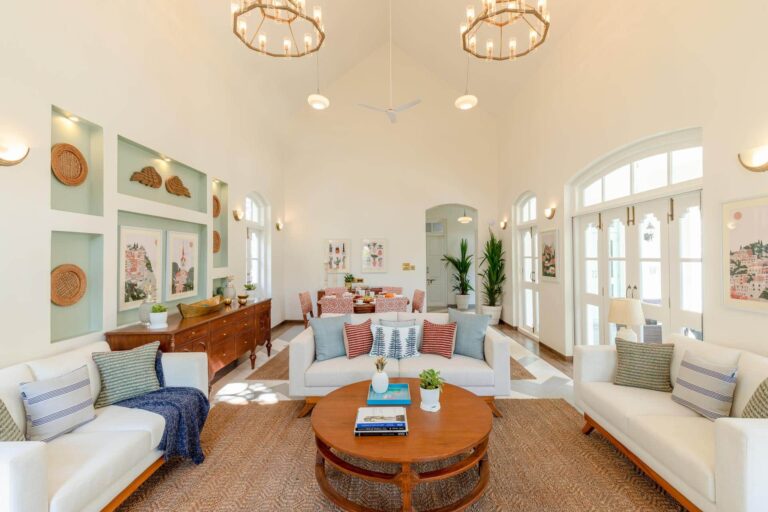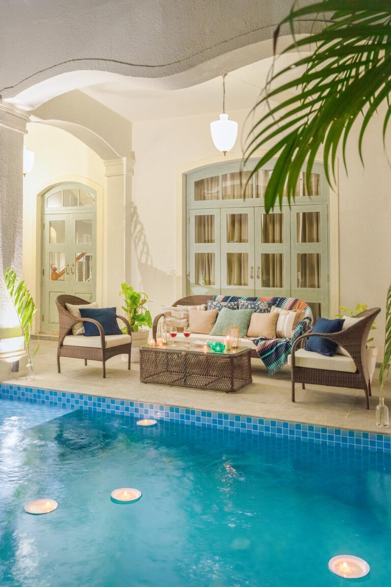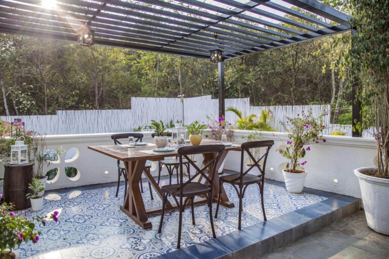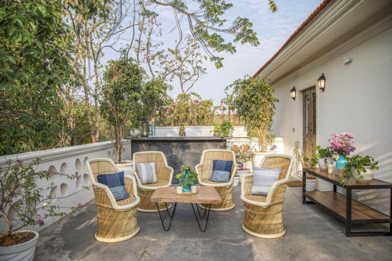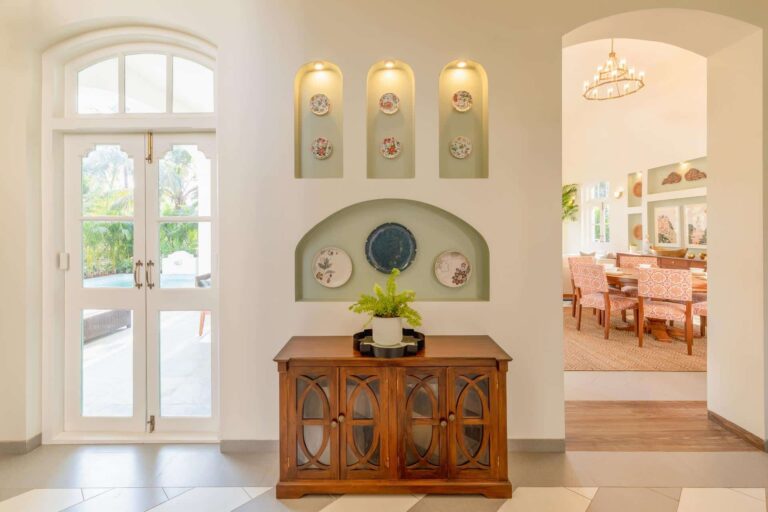 With winding country lanes, beautiful Portuguese homes, whitewashed churches and lush fields all around, Isprava’s Estate de Frangipani has found the perfect address. Estate de Frangipani is where nature, serenity and comfort come together with Isprava’s signature aesthetics. Spread across ~3,750 sqm, Estate de Frangipani sits at the top of a gradually sloping hill, overlooking verdant greenery. In this luxurious estate, you can sit back and relax as you listen to the birds’ chirp and wind rustle. This palatial estate is designed using traditional Indian techniques and infused with Portuguese and Mediterranean inspired aesthetics.