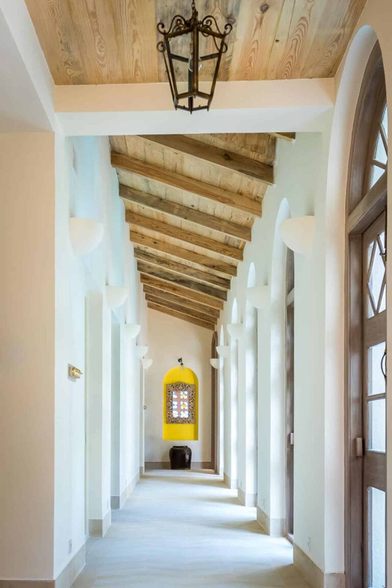 A cupola foyer opens into a small garden courtyard surrounded by wide walkways with gleaming off-white stone flooring. To the right, past an enormous vintage trunk, is a larger rectangular courtyard with a swimming pool.