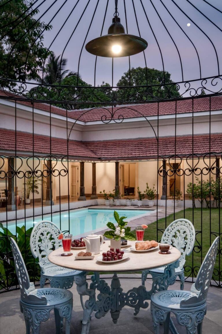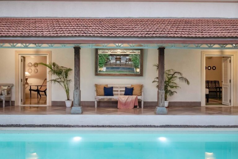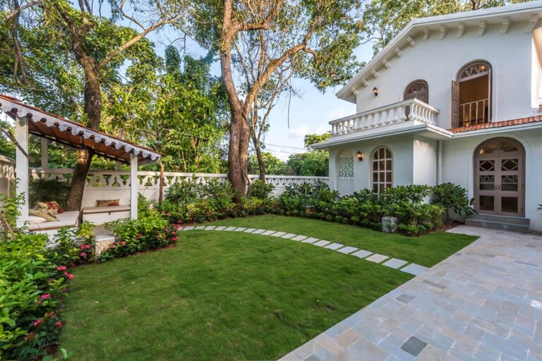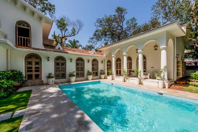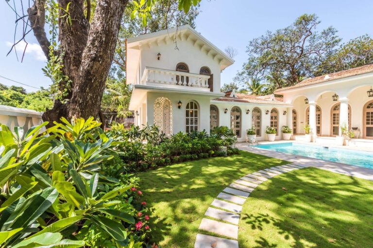 Villa Evora located in Assagaon, Goa sits on a beautiful forest plot of ~ 735 sqm and has a BUA of ~ 305 sqm, having four (ensuite) bedrooms, having a private pool and a vibrant lush green lawn with sit outs.