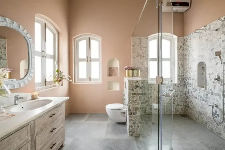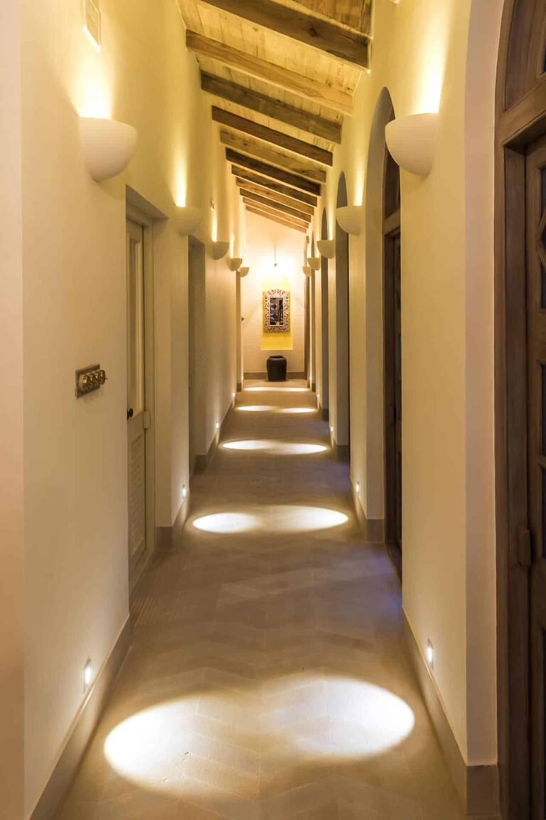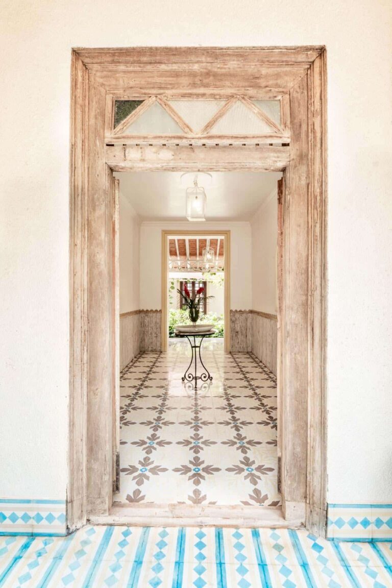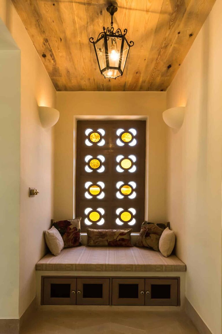 A palace door leads through a foyer and into a small garden courtyard with wide walkways showcasing the colours of pink earth. Ancient metal chains hang from the tiled roof to channel rainwater into the ground. To the right, is a larger courtyard housing a turquoise pool.